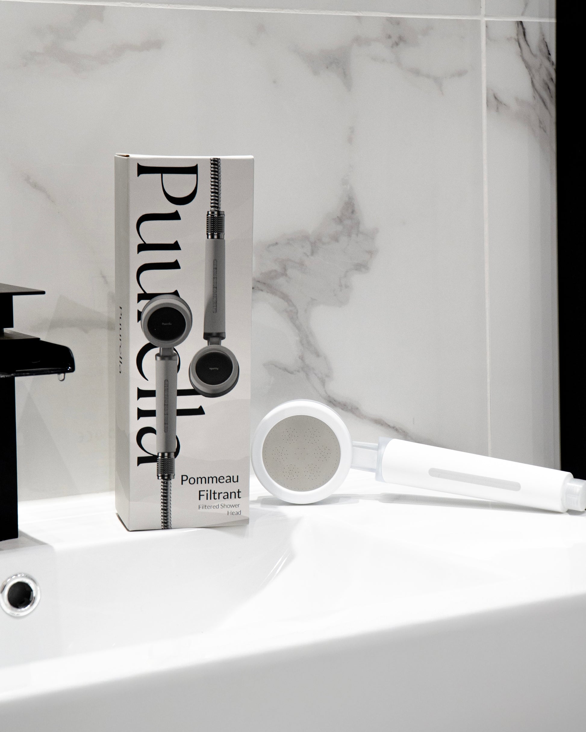 Si tu choisis l’Offre d'Été, ton pommeau Puurella est livré prêt à l’emploi, avec 2 filtres de remplacement offerts directement intégrés :