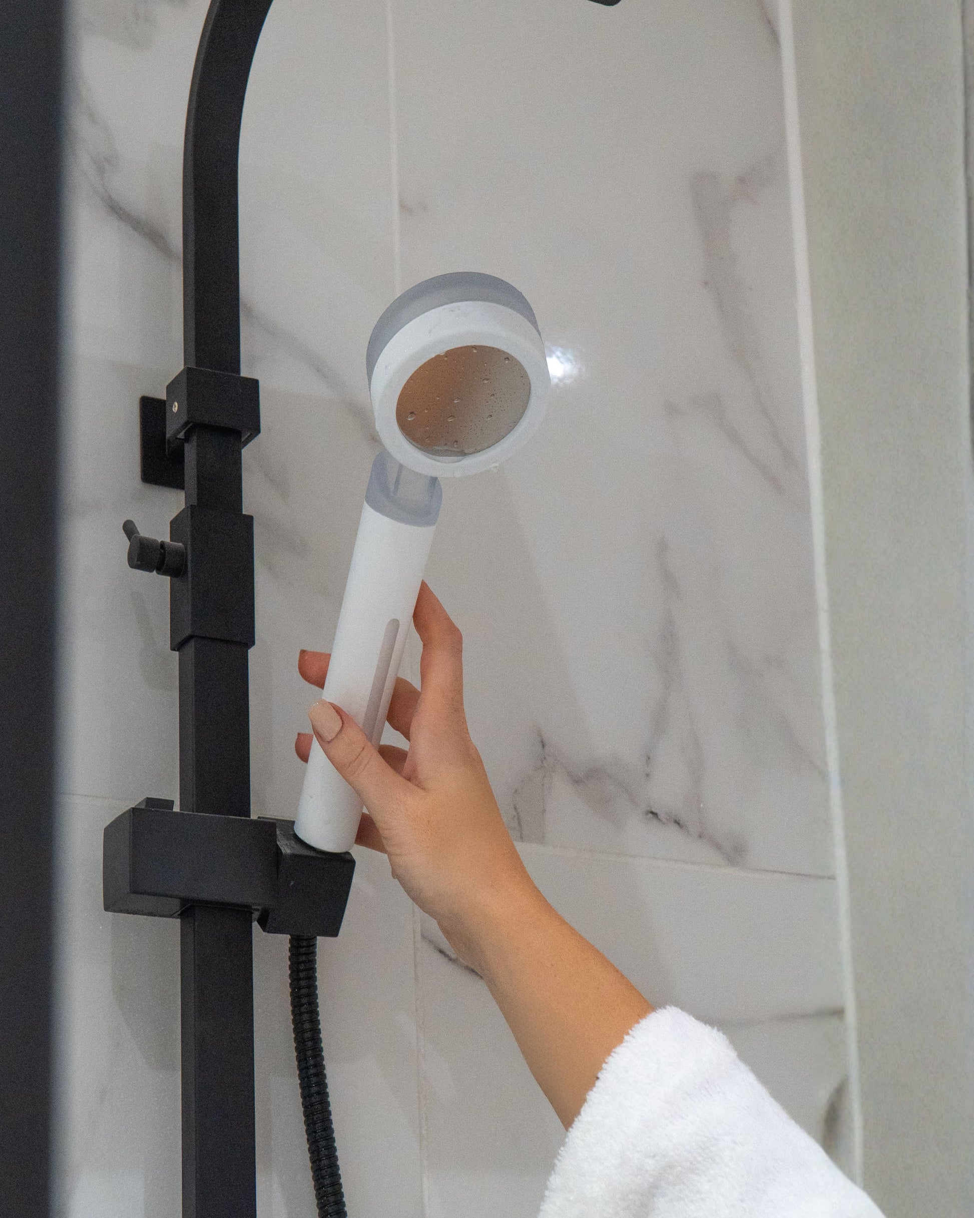 Mais si l’eau de la douche est pleine de calcaire… Tous ces soins partent dans le tuyau.