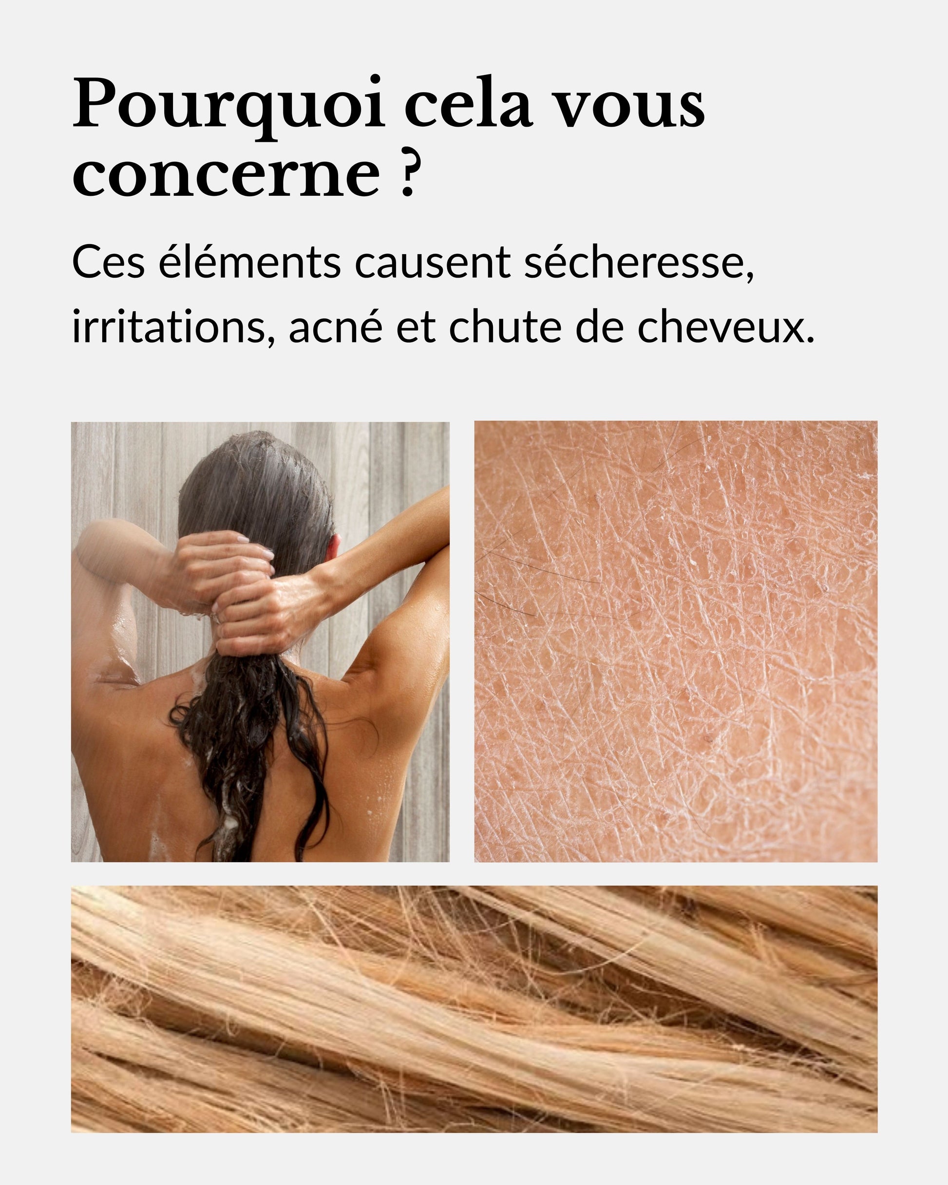 Ensemble, ils éliminent les huiles naturelles qui protègent vos cheveux. Résultat, à chaque douche : cheveux plus secs, plus ternes, plus cassants.
